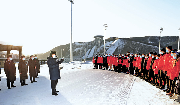 在国家冬季两项中心看台,习近平观看了冬季两项越野滑雪和射击运动员接力训练情况,并看望慰问国家冬季两项、跳台滑雪队运动员、教练员和张家口赛区运行保障团队、建设者代表。习近平亲切地对大家说,我这次来考察北京冬奥会、冬残奥会筹办情况,也是在牛年春节前来看望大家。大家都在为办好一届成功的冬奥盛会而努力,运动员在刻苦训练,建设单位和建设者、保障团队兢兢业业,成功打造了一批世界一流的精品工程,大家的奋斗精神、奉献精神令人感奋。习近平强调,北京冬奥会、冬残奥会所有场馆建设提前一年完成,我国很多冰雪项目在两年多时间里实现从无到有,有的项目达到了世界先进水平,充分体现了党的领导和举国体制、集中力量办大事的制度优势。