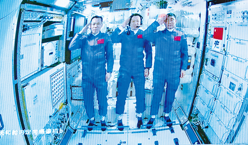 图为6月17日在北京航天飞行控制中心拍摄的进驻天和核心舱的航天员向全国人民敬礼致意的画面。新华社记者 金立旺 摄