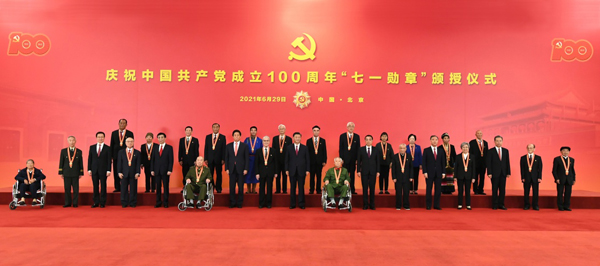 今天,在庆祝中国共产党成立一百周年之际,我们在这里隆重举行仪式,将党内最高荣誉授予为党和人民作出杰出贡献的共产党员。