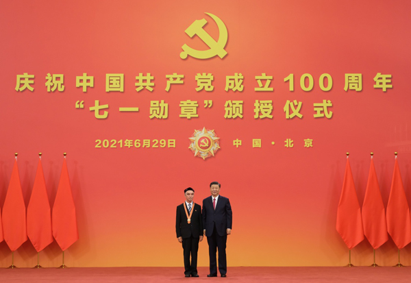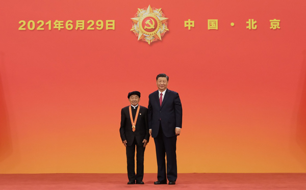 6月29日,庆祝中国共产党成立100周年“七一勋章”颁授仪式在北京人民大会堂金色大厅隆重举行。中共中央总书记、国家主席、中央军委主席习近平向“七一勋章”获得者黄大发颁授勋章。新华社记者 李学仁 摄