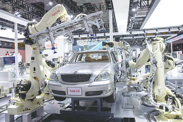 11月5日至10日,第五届中国国际进口博览会在国家会展中心(上海)举行。图为11月5日,在进博会技术装备展区,日本公司NACHI带来的高速、多用途SRA系列机器人正在组装汽车。 (图片来源:视觉中国)