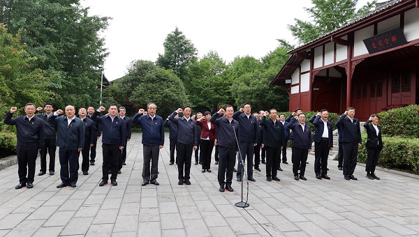 6月5日,参加省领导干部主题教育读书班的全体学员在扎西会议会址,重温入党誓词。