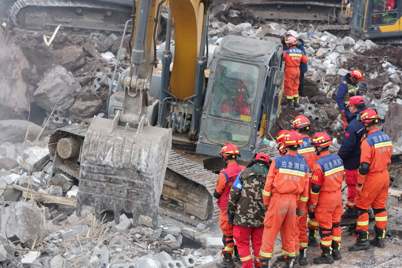 1月25日上午,凉水村山体滑坡点现场搜救进入第四天,在又一夜持续奋战后,搜救现场依然机声隆隆,中国安能救援队的大型挖掘机挥动铁臂繁忙作业。图为救援人员在凉水村山体滑坡点现场进行搜救。(杨文佳 摄)