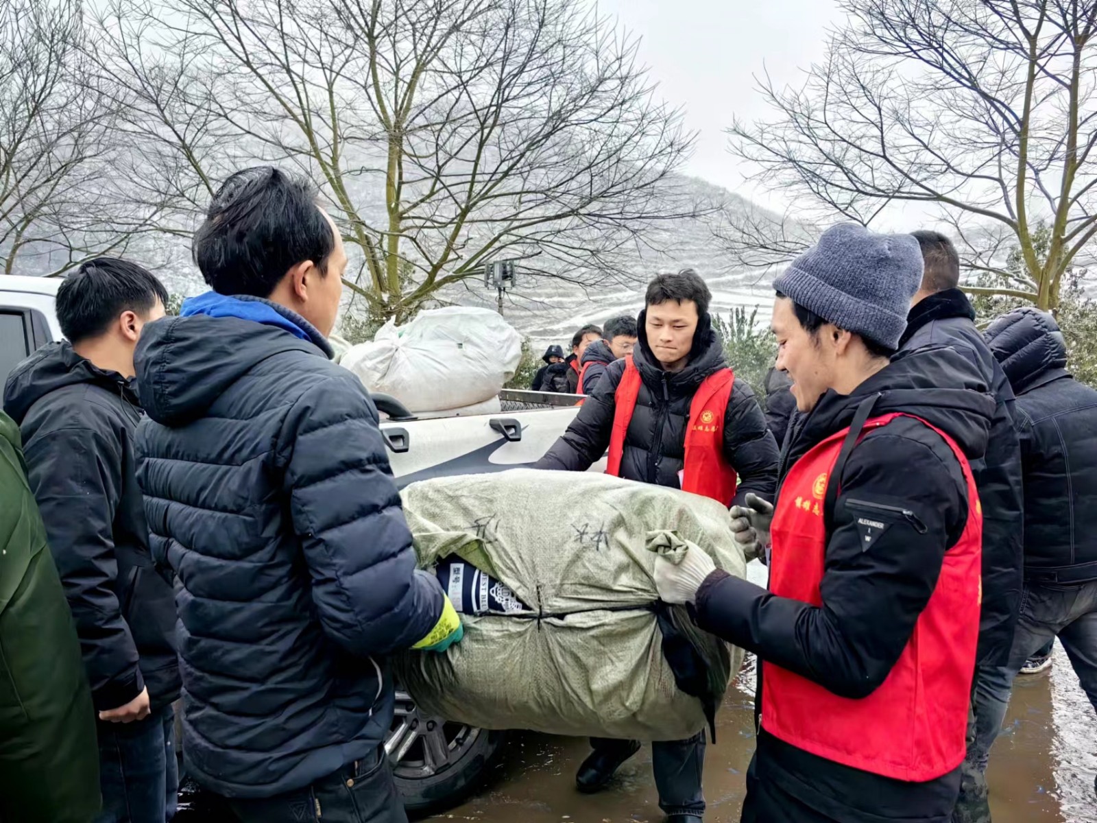 为确保受灾群众有地方住、有热饭吃、有热水喝,镇雄县组建了隐患排查、转移安置、医疗救护、除雪保通、善后处置等党员先锋队,开展抢险救援、受灾群众安置、救援后勤保障等相关工作。图为志愿者们接力把救援物资搬运到集中发放点,统一发放到群众手中。(杨文佳 摄)