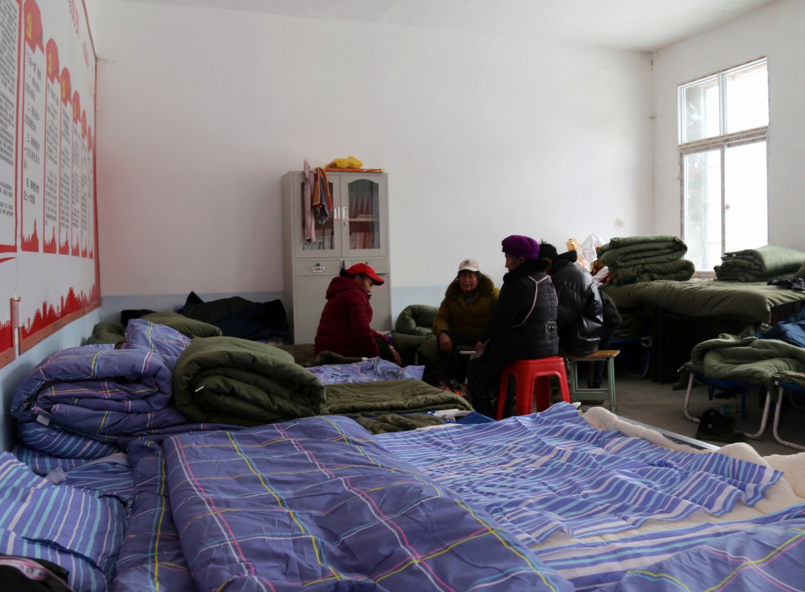 1月25日,镇雄县塘房镇凉水村和平小学老校区临时安置点房间内整齐地铺着棉被,几名受灾群众正围坐在一起烤火取暖。(昭通市纪委监委 马永亮 摄)