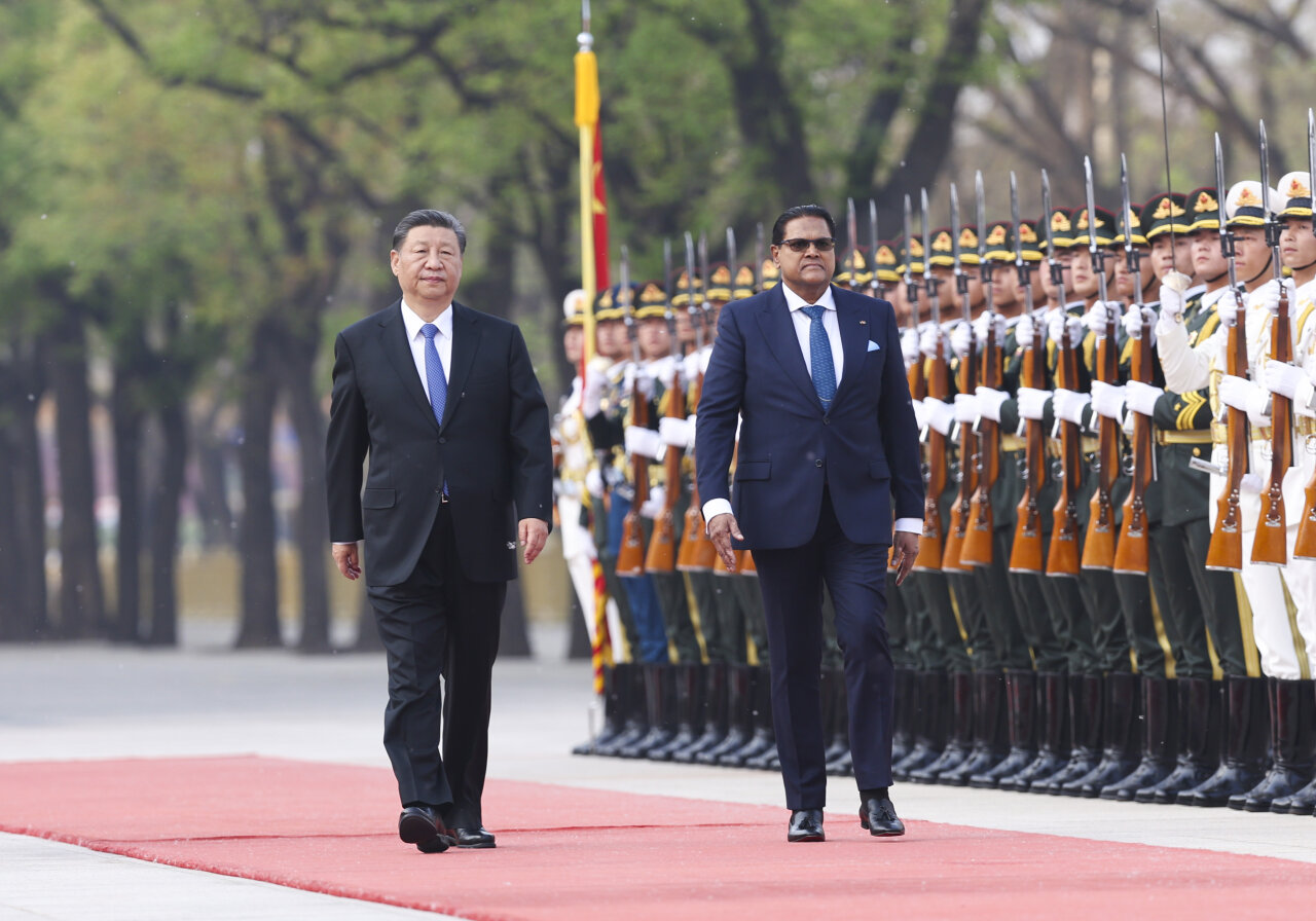 4月12日下午,国家主席习近平在北京人民大会堂同来华进行国事访问的苏里南总统单多吉举行会谈。这是会谈前,习近平在人民大会堂东门外广场为单多吉举行欢迎仪式。新华社记者 丁海涛 摄