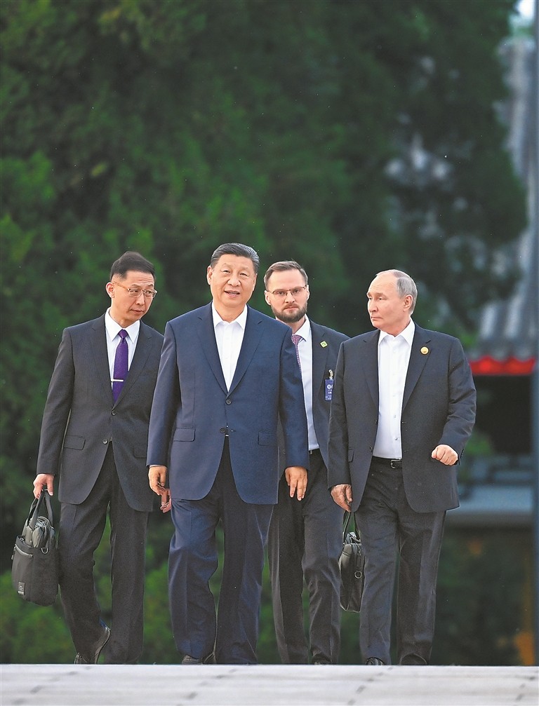 习近平在瀛台桥前迎接普京。两国元首边走边谈,看亭台楼榭,赏万物并秀。