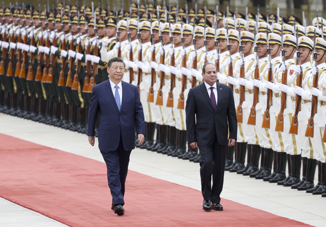 塞西抵达时,礼兵列队致敬。两国元首登上检阅台,军乐团奏中埃两国国歌,天安门广场鸣放21响礼炮。塞西在习近平陪同下检阅中国人民解放军仪仗队,并观看分列式。
