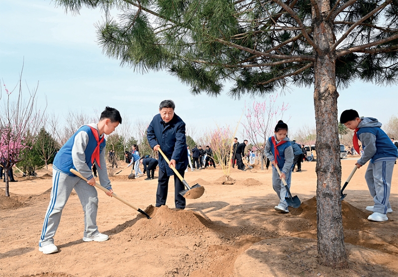 2025年4月3日,党和国家领导人习近平、李强、赵乐际、王沪宁、蔡奇、丁薛祥、李希、韩正等来到北京市丰台区永定河畔参加首都义务植树活动。这是习近平同大家一起植树。 新华社记者 谢环驰/摄