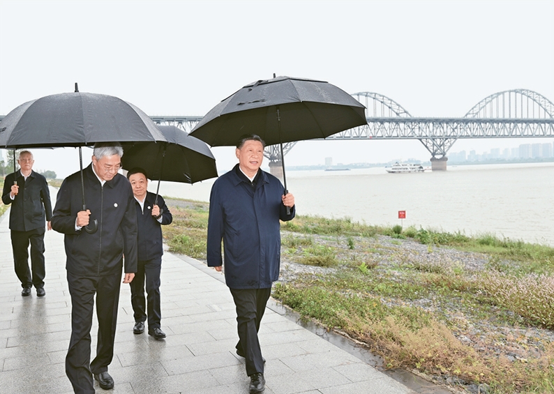 2023年10月10日至13日,中共中央总书记、国家主席、中央军委主席习近平在江西考察。这是10日下午,习近平在长江国家文化公园九江城区段考察时,冒雨沿江堤步行察看沿岸风貌。 新华社记者 谢环驰/摄