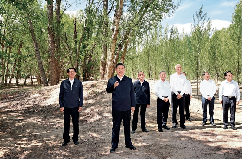 2023年6月5日至6日,中共中央总书记、国家主席、中央军委主席习近平在内蒙古巴彦淖尔考察,并主持召开加强荒漠化综合防治和推进“三北”等重点生态工程建设座谈会。这是6日上午,习近平在临河区国营新华林场考察。 新华社记者 谢环驰/摄