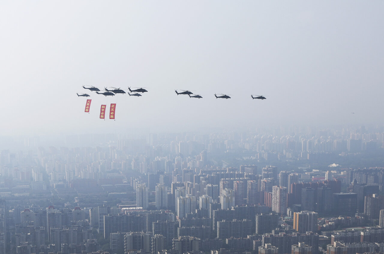 9月3日,纪念中国人民抗日战争暨世界反法西斯战争胜利80周年大会在北京隆重举行。这是空中护旗梯队。新华社记者 胡星宇 摄