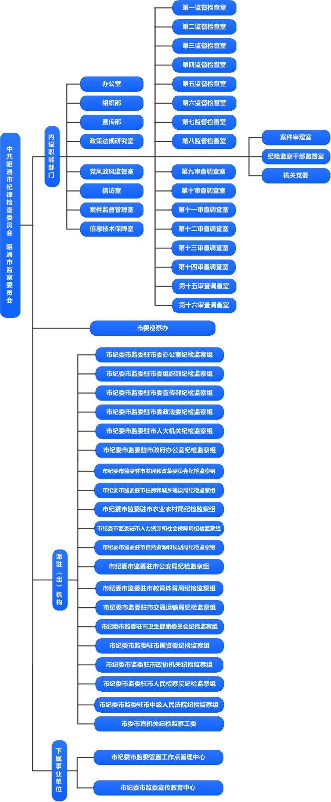 昭通市纪委市监委共设有26个内设机构和机关党委。内设机构具体为:办公室、组织部、宣传部、政策法规研究室、党风政风监督室、信访室、案件监督管理室、信息技术保障室、第一至第八监督检查室、第九至第十六审查调查室、案件审理室、纪检监察干部监督室。