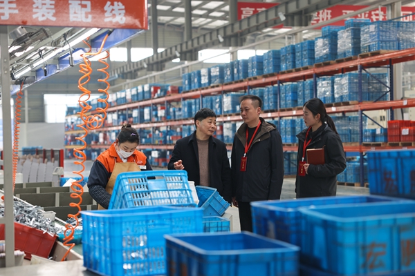 浙江省永康市纪委监委聚焦本土五金产业,将监督“探头”架到工厂车间和市场一线,精准祛除政策落实中的“梗阻”,用心解决群众急难愁盼问题,以精准、有力、温暖的监督,为特色产业发展清障赋能。图为该市纪检监察干部深入企业一线了解惠企政策落实情况。(浙江省永康市纪委监委 施静祎 摄)